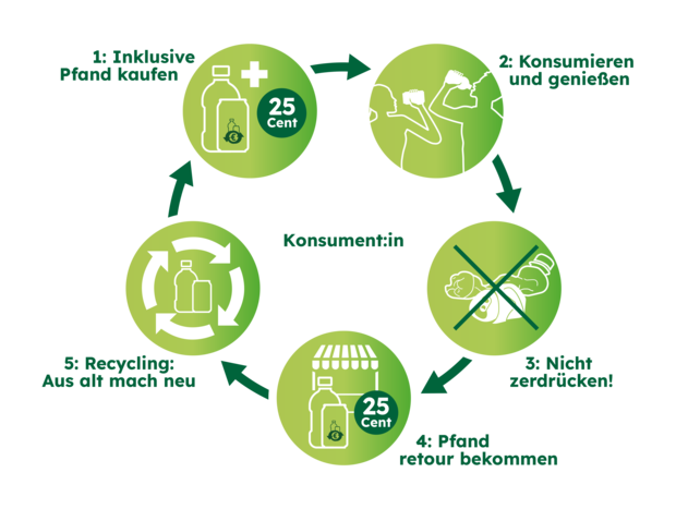 Ab 1. Jänner 2025 werden Einweggetränkeverpackungen aus Kunststoff und Metall mit einem Volumen von 0,1 Liter – max. 3 Liter mit einem Pfand in Höhe von 25 Cent versehen.