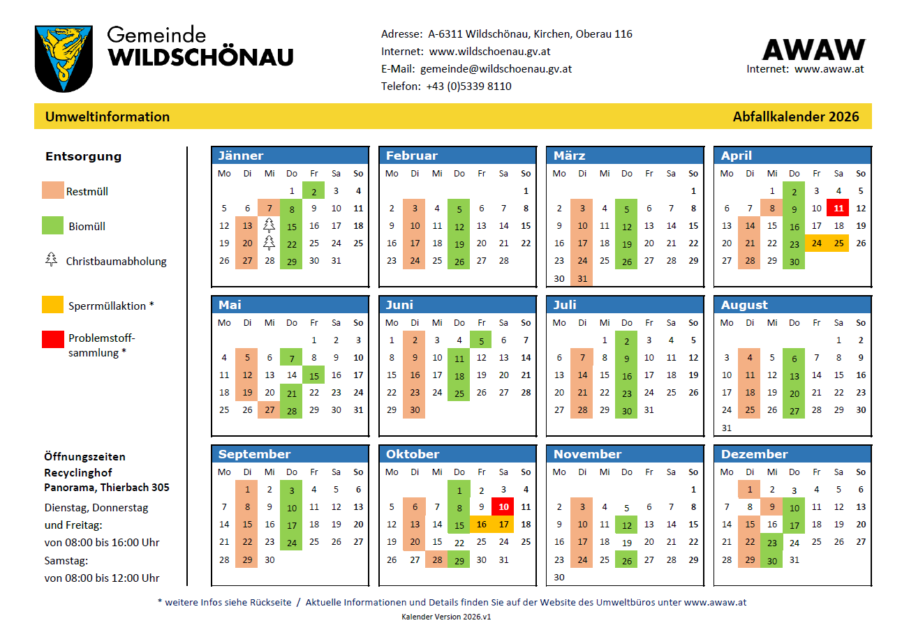 Im Abfallkalender 2026 sind alle Termine bezüglich Restmüllentsorgung, Biomüllabholung, Problemstoffsammlungen, Sperrmüllaktionen auf dem Recyclinghof eingetragen. Weiters sind die Christbaumabholungstage und Öffnungszeiten des Recyclinghofs darin ersichtlich.
