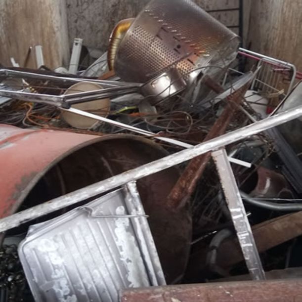 Badewanne (Metall) , Dachrinnen , Drahtzäune , Eisenrohre , Eisenteile , Fahrrad , Metallfässer (leer) , Eisengitter, Ofen , Aluminiumteile, Blechteile , alle Metallteile, die keine Verpackungen sind , Pfannen , Töpfe , Maschinen- und Fahrzeugteile , Armaturen, Metallwerkzeuge , Schrauben , Nägel , Besteck , ....